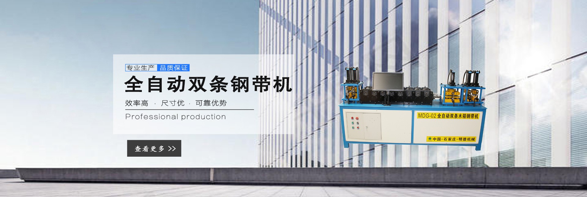 石家莊明德包裝機械有限公司,是國內專業生產木箱雙條鋼帶機、美式托盤打釘機械、托盤刨槽機、倒角機、木包裝箱、木托盤的生產廠家,目前擁有廠房3000多平方米,自動化生產設備數十套。 公司下轄包裝機械事業部,主要生產新型全自動木箱鋼帶機、全自動(半自動)木箱鎖扣機、折疊鋼帶箱機械、鋼帶箱壓板機、美式托盤自動打釘機、托盤刨槽機、倒角機等相關鋼帶木箱機械、木工機械、配套產品,設備主體部分由高品質機械和高精度模具組成,液壓系統、伺服系統和低壓配電單元的主要元器件,均選用西門子、施耐德等國際和國內產品,大大提升了產品質量,設備長時間運行穩定可靠,獲得了用戶的一致好評。 公司下轄包裝制品事業部,主要生產各種實木木箱、膠合板鋼帶木箱和實木熏蒸托盤、歐標托盤、美標托盤、亞標托盤及相關配套產品,木箱和托盤均選用優質九厘板材和俄羅斯原木作為原材料,從生產制造、成品組裝、出廠質檢到送貨上門,售后服務等,做到一條龍服務,始終堅持“把質量做到更好,把成本降到更低,把實惠讓給客戶“的經營原則。